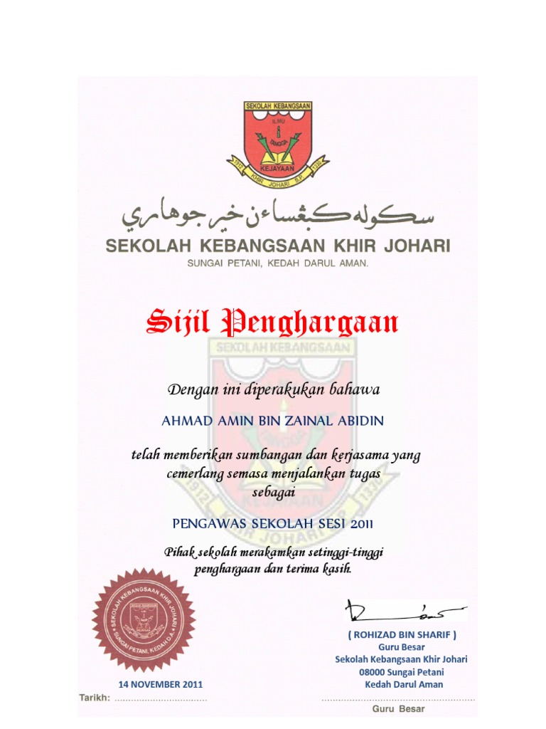 Sijil Penghargaan Pengawas Sekolah / 7/22/2019 sijil penghargaan pengawas pss 1/1sekolah kebangsaan manggol bongormegat dewa 06100 kodiang,kedah darul aman.adalah dengan ini diperakui bahawadaniell qhamar bin mahamad noortelah dilantik dengan rasmi sebagaiahli.
