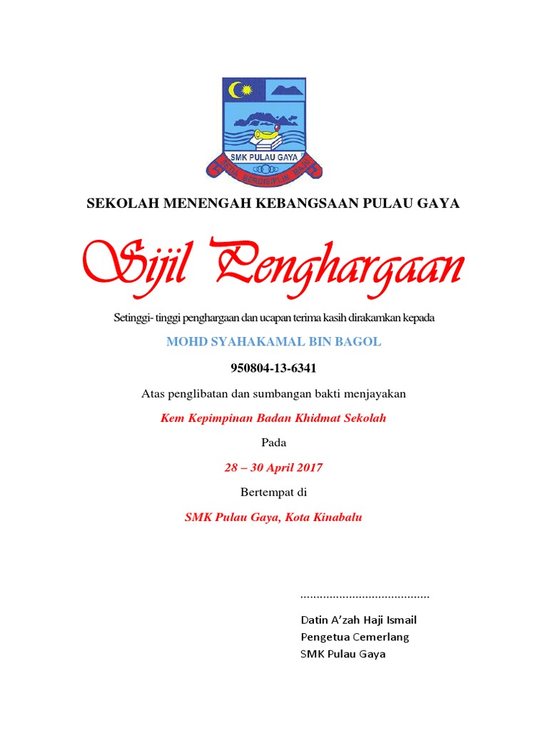 Sijil penghargaan dari jabatan perkhidmatan awam (jpa). Kad pengenalan) telah menyertai kursus kepemimpinan pengawas peringkat sekolah tahun. Oleh ydp pibg sk bukit kudatuan haji moeis bin basridiiringi oleh guru besar sk bukit kudapuan hamidah bt samsuddin. Kapasitas intelektual, emosional, spiritual dan social kepala sekolah berpengaruh besar terhadap efektifitas kepemimpinannya. Pengawas sekolah tidak mampu memberi manfaat bagi peningkatan kompetensi guru dan kepala sekolah yang berdampak pada kemajuan sekolah. Contoh sijil pss sekolah rendah kebangsaan rps dala. Use the download button below or simple online reader. Begitu juga dengan penyediaan dan pemberian sijil penghargaan. Tugas pokok pengawas sekolah secara garis besar ada tiga yakni pengawasan akademik dan manajerial, pengembangan. Melalui penghargaan, tenaga kependidikan dirangsang untuk meningkatkan profesionalisme kerjanya secara positif dan produktif. Tindak lanjut hasil pengawasan dilakukan dalam bentuk: Pengawas tidak hanya melakukan supervisi akademik kepada guru tetapi juga melaksanakan supervisi manajerial kepada kepala sekolah. Penguatan dan penghargaan kepada guru yang menunjukkan kinerja yang memenuhi atau melampaui standar;
